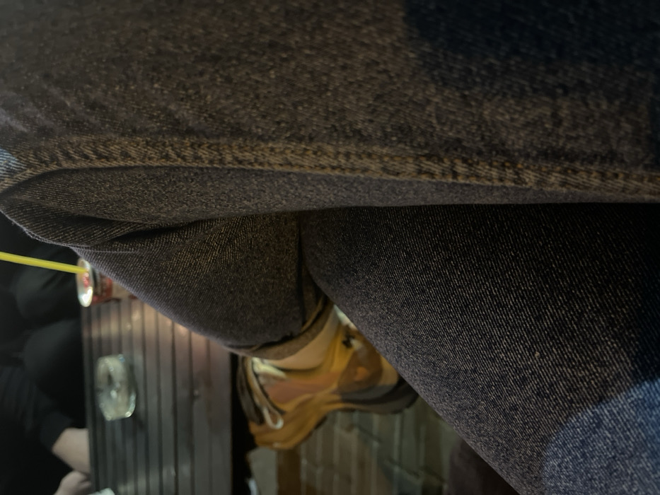 - "The image depicts a low-light scene featuring the crossed legs of an individual wearing blue denim jeans and a multi-toned sneaker in the foreground" by FM-8yfXX2, licensed under CC BY 4.0