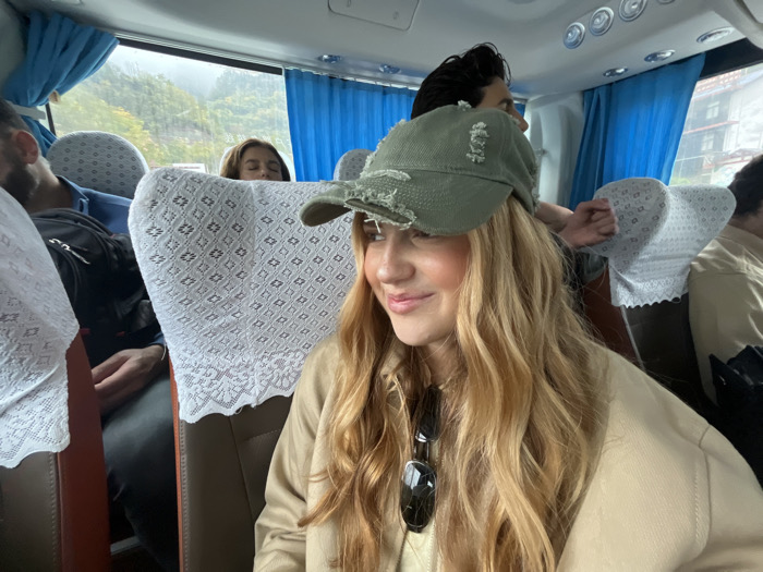 Inside a bus with blue curtains, a woman wearing a distressed green cap smiles