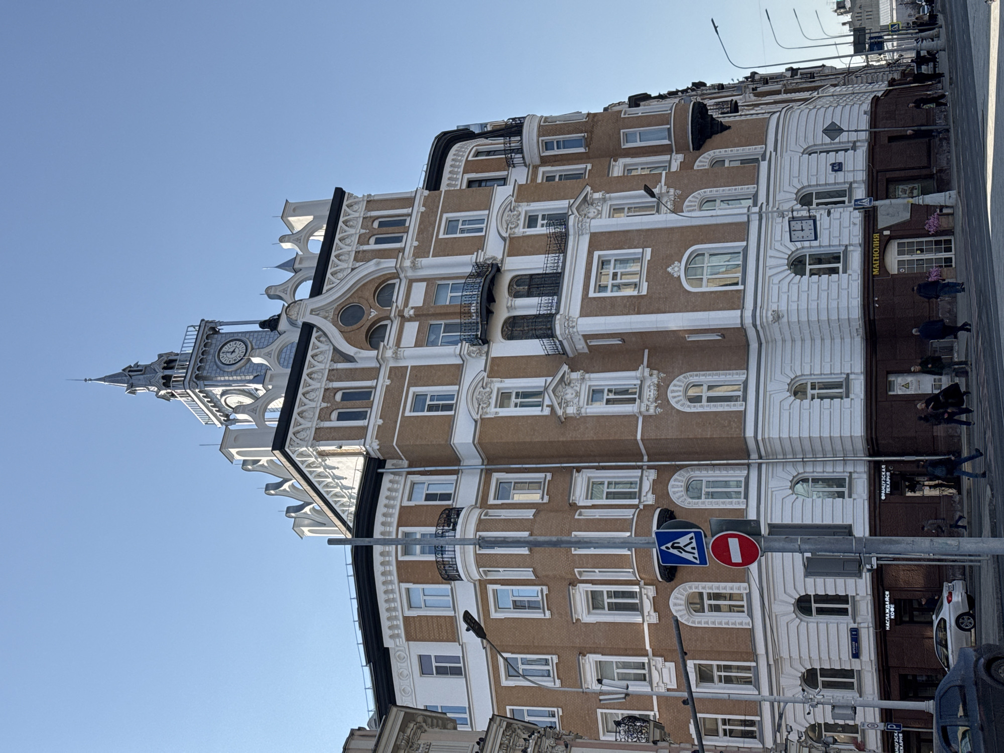 The image captures an urban street scene in Naro-Fominsk, Russia, specifically focusing on a prominent multi-story building at Ulitsa Lenina (Lenin Street). The building features a reddish-brown brick facade with extensive white architectural detailing, including pilasters, cornices, and ornate window surrounds. A distinctive clock tower with a grey spire, housing a visible clock face displaying approximately 10:45, crowns the structure. The roofline is adorned with white, decorative crests. Multiple balconies with black wrought-iron railings are present on various floors, some curved and others flat. The ground floor, differentiated by a dark brown base, accommodates commercial enterprises, evidenced by illuminated Cyrillic signage for "МАГНОЛИЯ" (Magnolia), "ФРАНЦУЗСКАЯ ПЕКАРНЯ" (French Bakery), and "НАСЛАЖДАЙСЯ КОФЕ" (Enjoy Coffee). The foreground features a paved road and a sidewalk. Several pedestrians, dressed in civilian clothing, are walking on the sidewalk and crossing the street. On the far left, a dark-colored sedan and a white sedan are partially visible. Street infrastructure includes tall streetlights, a utility pole, and various traffic signs, including a blue pedestrian crossing sign and a red "No Entry" sign. The sky is clear blue, indicating fair weather conditions.