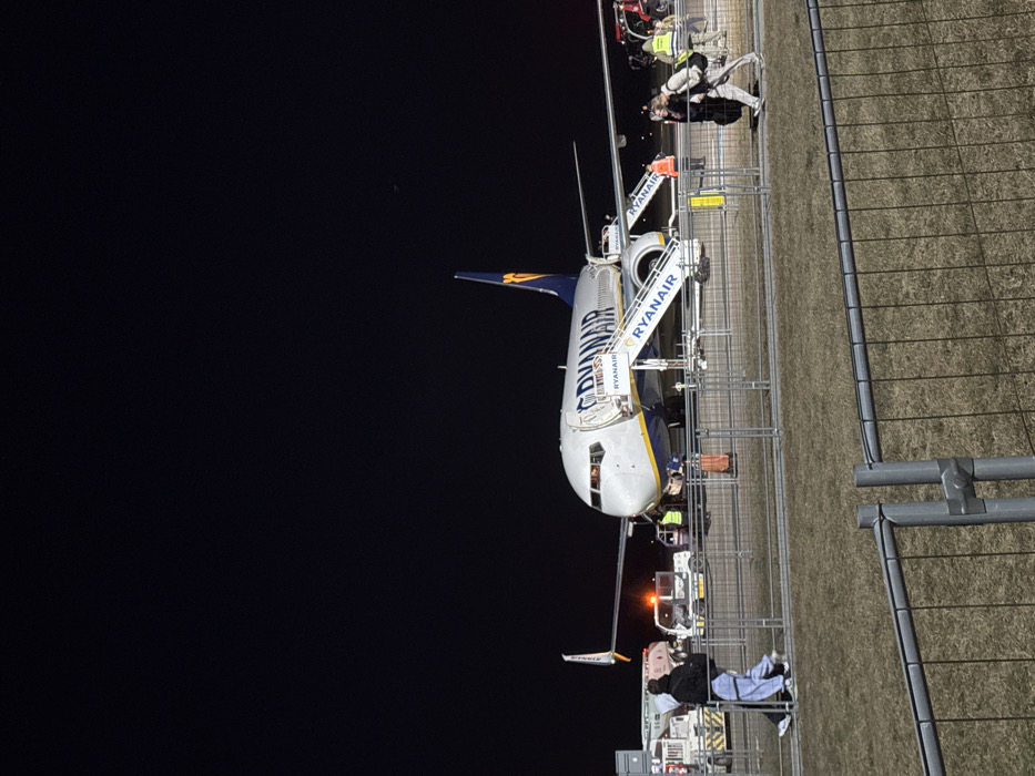 At night, on an airport apron in Nowy Dwór Mazowiecki, Poland, a white and blue Ryanair Boeing 737 aircraft is stationary. The aircraft displays "RYANAIR" branding on its fuselage and winglets. Mobile stairs, also branded "RYANAIR," are attached to both the front and rear passenger doors, which are open. The aircraft is illuminated by artificial light sources, casting some light onto the dark sky. Multiple individuals are present. In the mid-ground, a person in a dark jacket and light pants walks left, away from the aircraft. In the right foreground, two individuals walk right, carrying luggage. The person closer to the camera wears a light jacket and dark pants, holding a dark duffel bag. Ground crew personnel in high-visibility orange or yellow vests are visible around the aircraft, indicating active ground operations. Several ground support vehicles are positioned near the aircraft. To the left of the aircraft, a white fuel or service truck with a large tank and flashing amber lights is present. Another smaller ground vehicle with amber flashing lights is near the aircraft's nose gear. A red vehicle with white markings is partially visible on the far right. The immediate foreground features a metal temporary fence separating the viewer's area from the aircraft and tarmac. Beyond the fence, the ground consists of exposed dirt and sparse vegetation, transitioning to a paved tarmac surface closer to the aircraft. The overall scene indicates active passenger and ground service operations at an airport during nighttime.