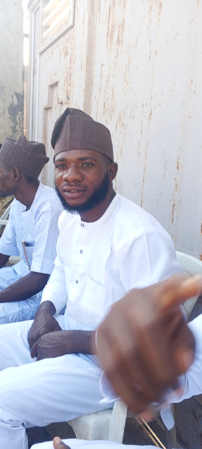The scene is set outdoors in Afaka, Nigeria. Three individuals are present. The primary subject, an adult male with dark skin, a trimmed beard, and mustache, is positioned centrally in the frame, looking directly forward. He wears a dark brown cap, a white long-sleeved band-collar tunic with five dark buttons down the front, a left breast pocket, and white trousers. He is seated on a partially visible light-colored plastic chair, with his hands resting joined in his lap. To his left and slightly behind him, a second adult male, also with dark skin, is partially visible from the chest up, facing left. He wears a dark brown cap and a light-colored patterned long-sleeved garment, with a brown strap visible near the left chest area. In the immediate foreground, a blurry dark-skinned hand and forearm are visible in the lower right quadrant, pointing towards the central figure. The background consists of a weathered, light-colored corrugated metal wall exhibiting vertical rust streaks and discoloration. A rectangular vented opening with horizontal slats is visible in the upper section of this wall. To the far left, a darker, rough concrete wall is partially discernible.