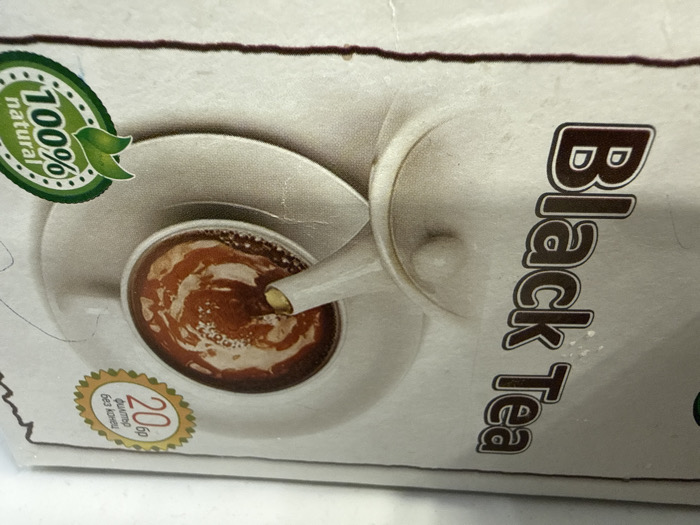 The image displays a close-up, angled view of a light-colored product package, likely cardboard, located indoors in Targovishte, Bulgaria. The package features an illustration of a white teacup resting on a white saucer, into which a white teapot is pouring a dark brown liquid with frothy, lighter brown patterns. Text is present on the package: "Black Tea" is printed vertically in dark brown outlined letters on the right side. A green circular sticker in the top-left corner states "100% natural" and displays two green leaves. A yellow-gold jagged-edged sticker in the bottom-left corner shows "20 бр." and "филтър без конец" in Cyrillic, indicating 20 pieces and "filter without thread." A thin, dark brown horizontal line runs near the top edge of the visible package. No people or active interactions are depicted. The package surface shows minor scuffs or dust.