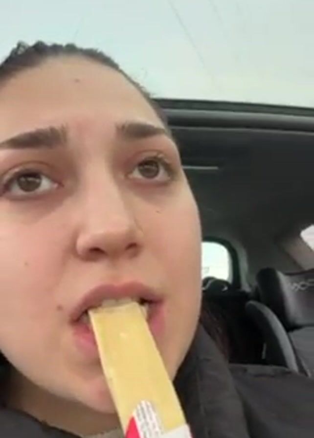 A woman is sitting in the passenger seat of a car, eating a cheese stick. She holds the cheese stick between her teeth and pulls it out slowly as she eats. The driver, a man wearing a black beanie and jacket, is holding a can of soda and driving. The car has a sunroof. The overall setting appears to be a cloudy day on the road.