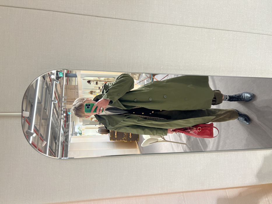 A person stands in front of a long mirror, holding a green phone to take a picture. The individual is wearing a long green trench coat, a striped shirt, a dark vest with gold buttons, green pants, and black boots. A red purse hangs from the person's left hand. The mirror reflects a modern retail space with exposed ceilings, track lighting, and displays of luggage.