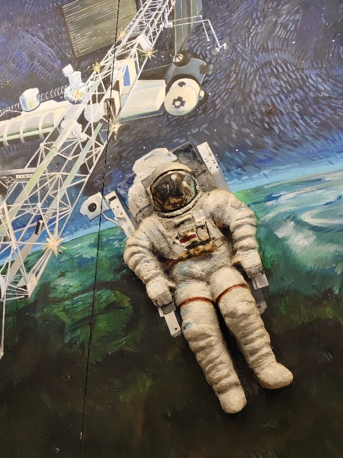 This image displays a mixed-media art installation, likely a mural or relief panel, located in Islamabad, Pakistan. The foreground features a three-dimensional astronaut figure, sculpted from a textured, off-white material with visible reddish-brown accents on the suit's chest and around the knees. The astronaut is positioned diagonally, appearing to float, with a dark, reflective visor on its helmet. The background is a painted depiction of space and Earth: a complex white structural framework, possibly a space station or satellite array, with star-like illumination points, occupies the upper left quadrant. The upper right and central sections portray dark blue and purple space with swirling patterns and scattered white dots representing stars. The lower background presents a curved representation of Earth from orbit, characterized by green landmasses and blue-white atmospheric or oceanic features. The overall artwork combines sculptural elements with painted details on a flat surface.
