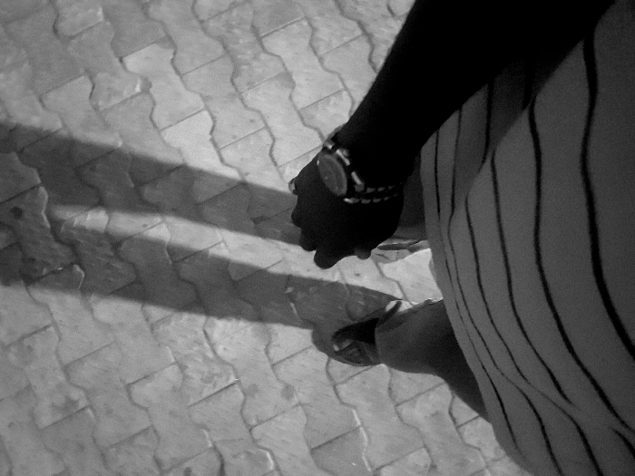From a high angle, a person stands on a patterned tile surface. A dark shadow stretches across the tiles. The person's arm, adorned with a watch, is visible on the right side, along with part of their striped garment. The person is wearing sandals on their feet. The scene is monochromatic and emphasizes the contrast between light and shadow on the textured ground.