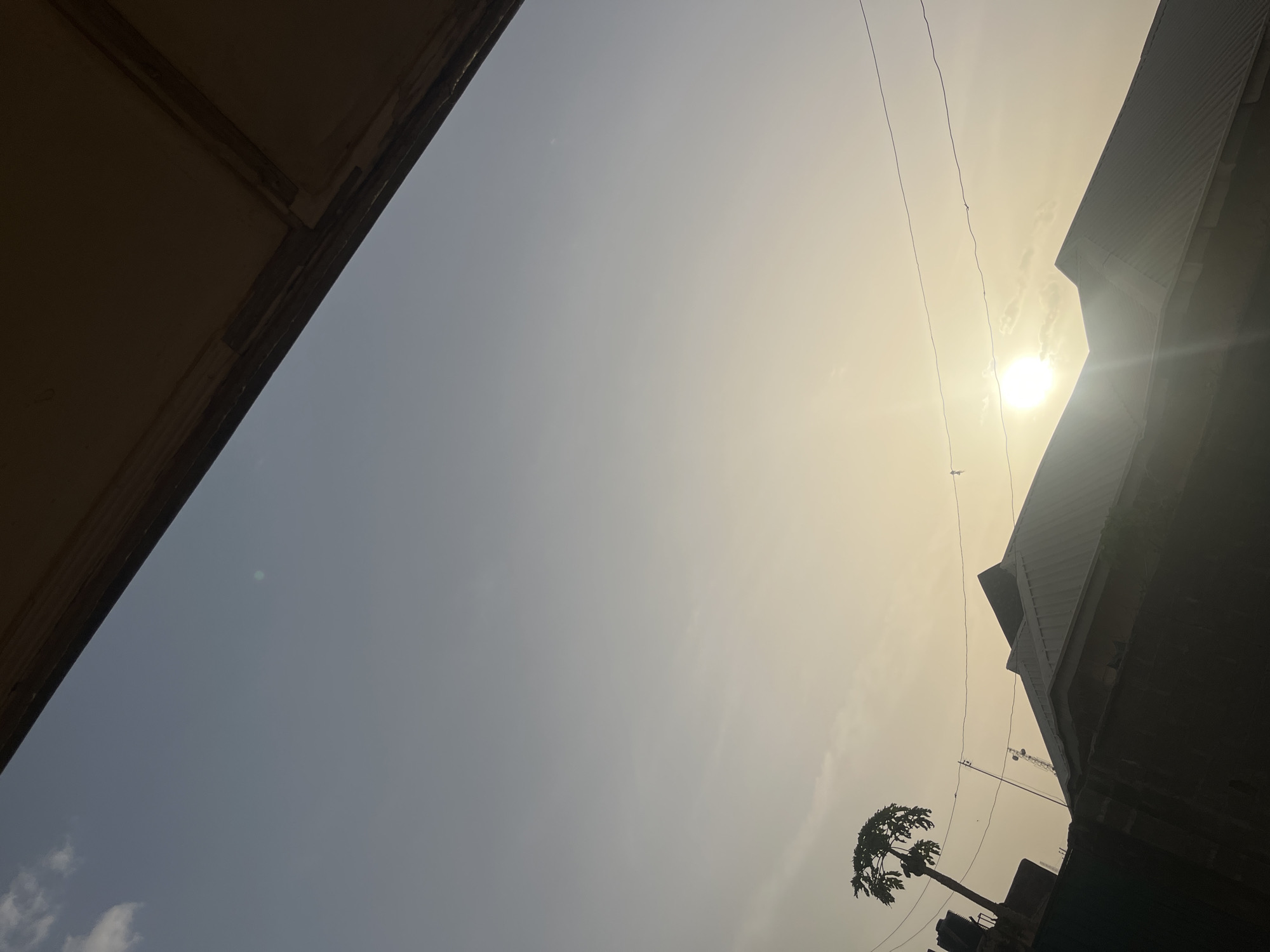 view looking upwards in what appears to be the city of Rido, Nigeria. A building is partially visible in the upper right corner, another in the upper left, and a tree in the lower right. Electrical wires stretch across the frame. The sky is bright, with the sun visible and casting a lens flare effect.