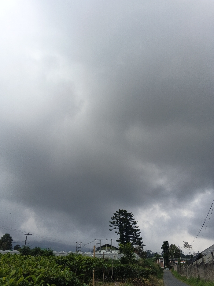 The image depicts an outdoor scene in Koipa, Papua New Guinea, under heavily overcast, dark grey skies. The upper two-thirds of the frame are dominated by dense cloud cover, indicating a gloomy or pre-storm atmospheric condition. In the foreground, lush green vegetation, possibly a tea plantation, occupies the lower-left quadrant. Moving towards the mid-ground, several white, domed structures, consistent with greenhouses, are visible amidst the greenery. Multiple utility poles with power lines extend across the middle distance. A prominent, tall, dark green coniferous tree stands centrally in the mid-ground, partially obscuring a building with a light-colored roof behind the greenhouses. To the right, a narrow, paved road or path descends, bordered by a textured concrete or stone wall. More scattered trees and indistinct buildings are visible along the road's edge. In the far background, faint outlines of mountains or hills are discernible, partially obscured by atmospheric haze or clouds. There are no people, animals, or discernible actions present in the scene. The overall environment suggests an agricultural or semi-rural setting.