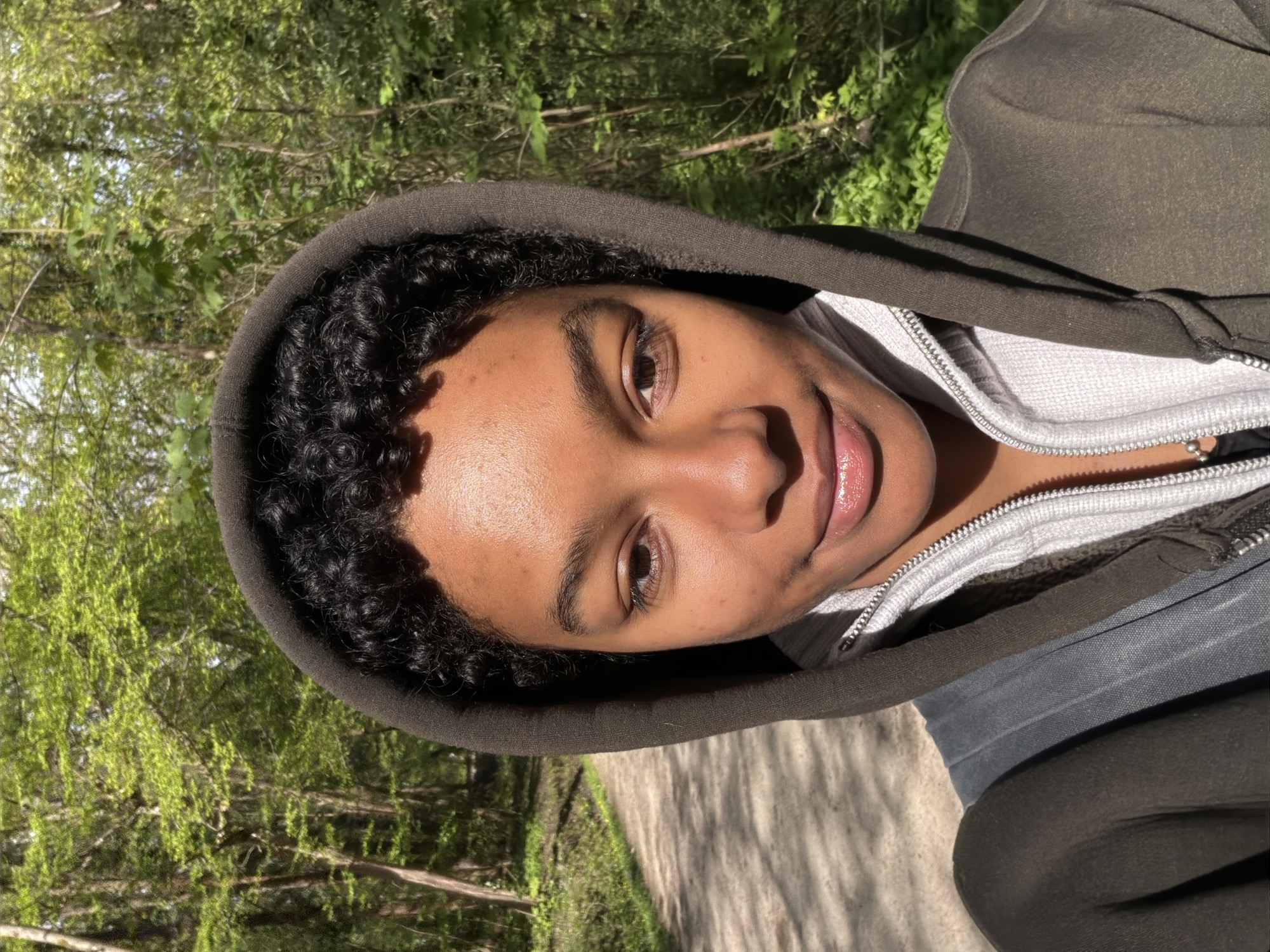 A person with dark hair and brown eyes, wearing a dark green hooded jacket over a light gray zip-up sweatshirt, is facing the camera in an outdoor setting. The person's face is well-lit, and they appear to be smiling slightly. The background consists of green trees and foliage, and a sunlit path is visible. Although there is no specific evidence indicating this image was taken in Noisiel, France, the natural landscape suggests a park or wooded area.