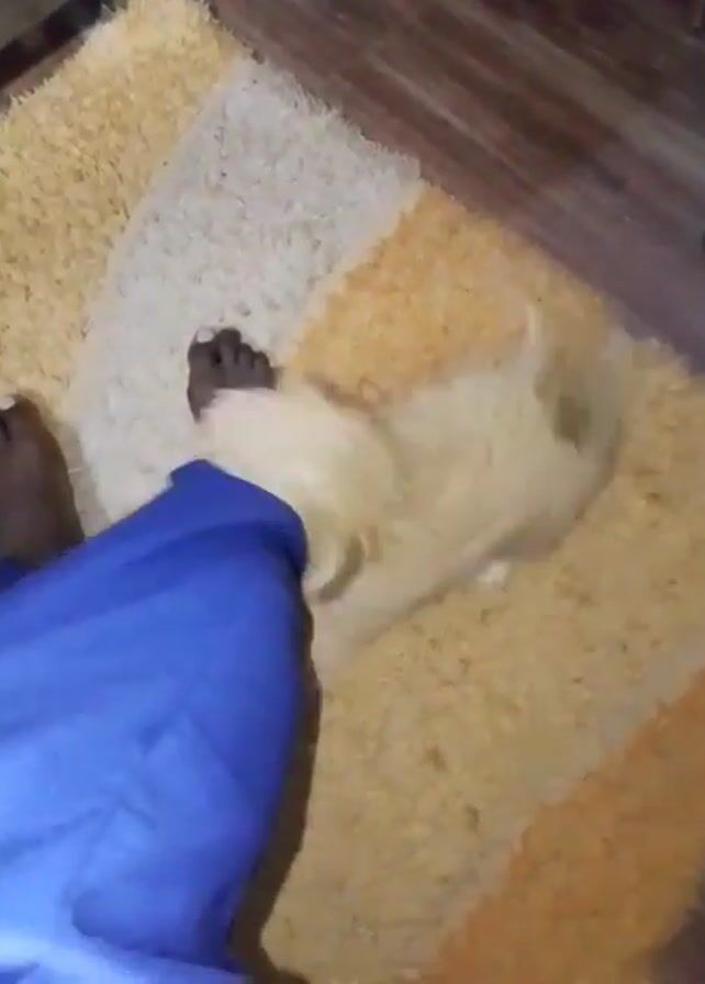 A person wearing blue pants stands on a shag rug with a small, light-colored dog at their feet. The dog repeatedly noses and rubs against the person’s left leg. The person’s bare feet are visible. Part of a wooden baseboard is visible behind the rug.