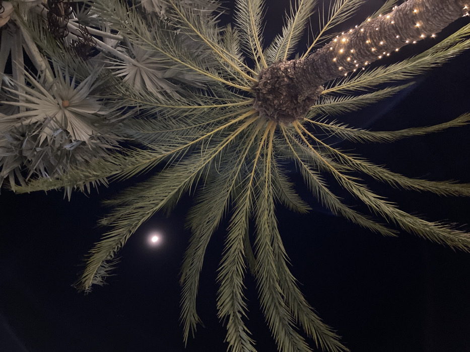 A low-angle shot captures a palm tree at night. The trunk is adorned with tiny lights, and several fronds radiate outwards, partly obscuring a bright moon. To the left, another palm tree with different-shaped leaves is visible, adding a contrasting element. The dark sky forms the background, highlighting the palm trees and the moon.