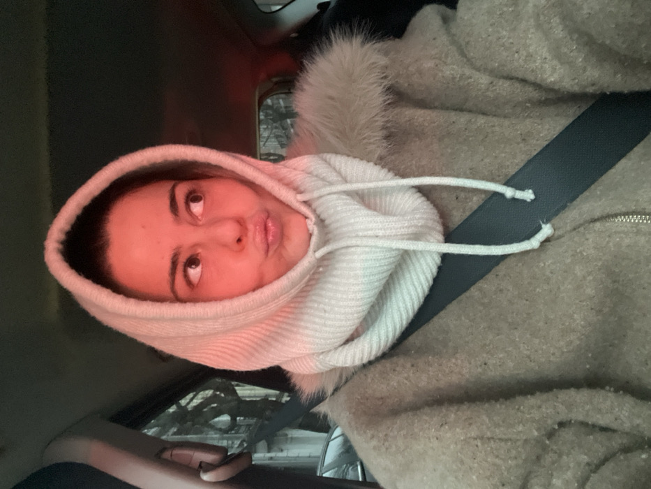 A young adult female is depicted in a close-up, front-facing perspective, seated inside a vehicle in the city of Roubaix, France. She wears a light-colored, ribbed knit balaclava-style hood with drawstrings, covering her head and neck. Over this, she has a textured, light brown or beige coat with a faux fur-trimmed collar visible on her right shoulder. A dark-colored seatbelt crosses her chest diagonally from her left shoulder. Her dark hair is pulled back, mostly concealed by the hood. Her eyes are directed towards the upper right of the frame, and her lips are pursed in a "fish face" expression. The scene is illuminated by a prominent reddish light source, casting a red hue over her face and parts of the car interior. Through the car windows, a blurred urban street scene is visible, including bare tree branches and building facades, suggesting an outdoor city environment, possibly during overcast daylight or twilight. The car interior shows dark headlining and a vertical trim piece on the left.