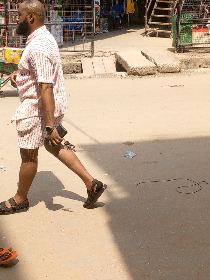 The image depicts an outdoor urban street scene in Onitsha, Nigeria, under direct sunlight, indicated by elongated shadows on the ground. A male individual, with a shaved head and a dark beard, is captured mid-stride, walking from left to right across the frame. He wears a light pink, vertically striped, short-sleeved collared shirt and matching shorts, with dark brown sandals on his feet. A dark smartwatch is on his left wrist, and he holds a dark smartphone and a keyring with multiple keys in his right hand. The ground is a light-colored, unpaved or dusty surface. Litter present includes a crumpled light blue plastic item and a dark, thin, coiled string or wire. A partial view of an orange sandal belonging to an unseen individual is visible in the lower-left foreground. In the background, behind a dark metal gate, are commercial establishments or shops displaying various items, including stacked blue chairs and hanging apparel (yellow and blue). To the right of the gate, a makeshift bridge or covering, constructed from two large concrete slabs and several wooden planks, spans over an open trench or drainage system. Further to the right, a wooden staircase or ladder ascends towards an unseen upper level of a building or structure. A green object, possibly a container, is also visible near the concrete slabs.