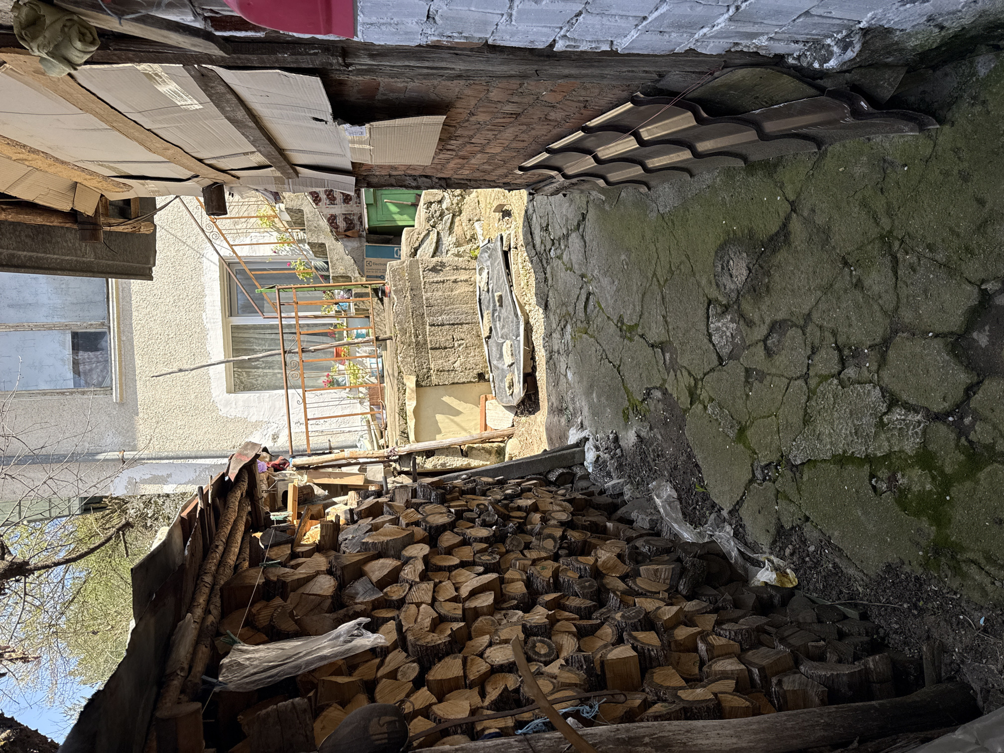 The image depicts a narrow alleyway in Gabrovitsa, Bulgaria. On the left side, a building with a window and a balcony with flowers is visible. Cardboard and other materials are used to construct a makeshift roof over a wood pile, which fills the lower left portion of the frame. The right side features a concrete wall or pavement with cracks and moss growth. Sections of roofing tiles lay on the ground or are propped against the wall. The alleyway is dimly lit.