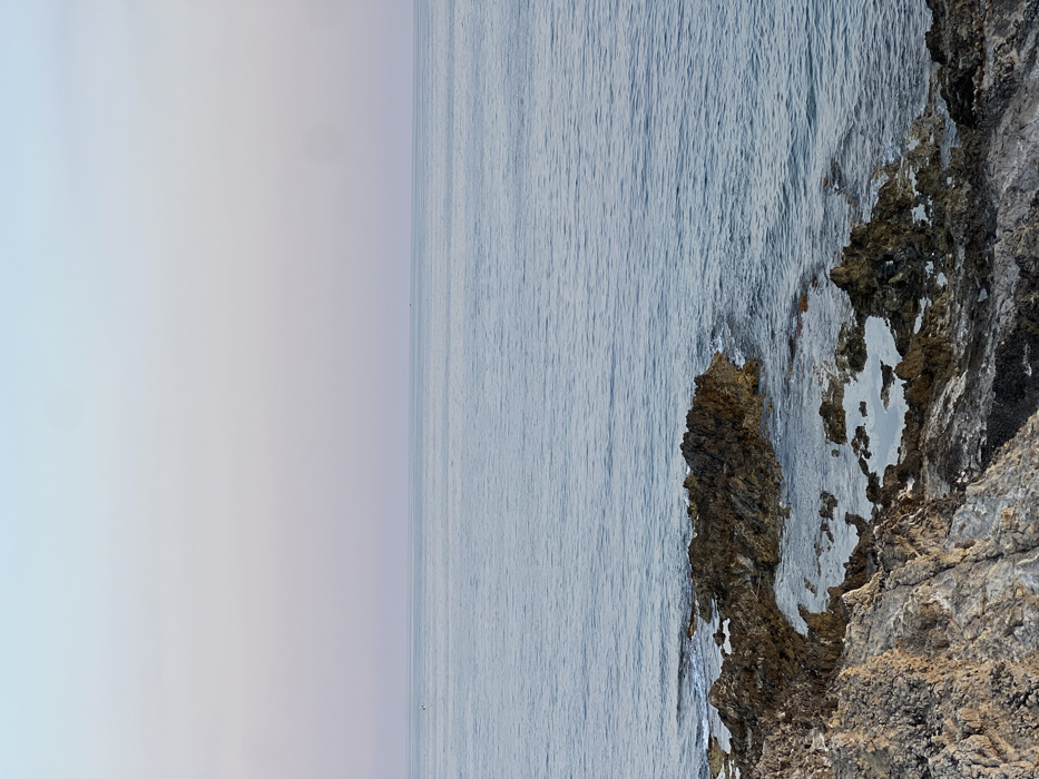 A scenic shot depicts a body of water meeting a rocky coastline. The water, appearing serene with faint ripples, stretches to the horizon under a pale sky. On the right, rugged rocks form the coast, their texture a mix of greys and browns with patches of white. The composition is such that the sky and water dominate the left, while the rocks occupy the right.