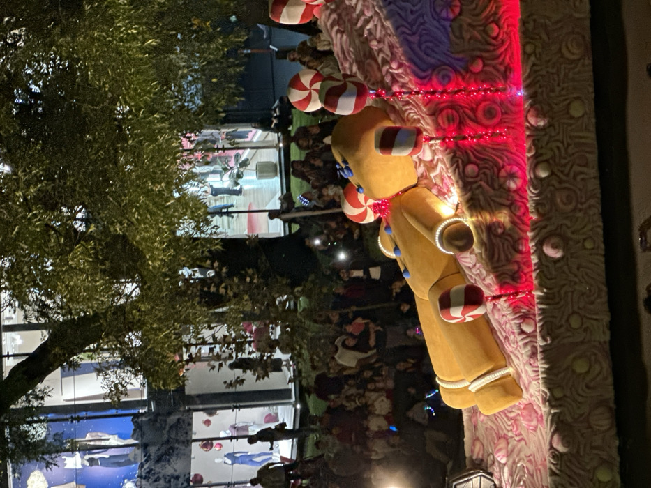 A gingerbread man statue stands near a building with mirrored windows. The statue has candy accents, including peppermint swirls and buttons. It's decorated with lights along its gingerbread house-style support structure. A crowd of people stands behind the statue, their reflections partially visible in the nearby windows. A tree with dense foliage is near the structure and the reflective surface. The time of day appears to be night.