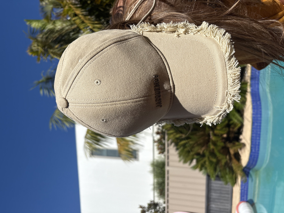 - "A tan Jacquemus baseball cap with a fringed brim" by FM-gAWbO2, licensed under CC BY 4.0