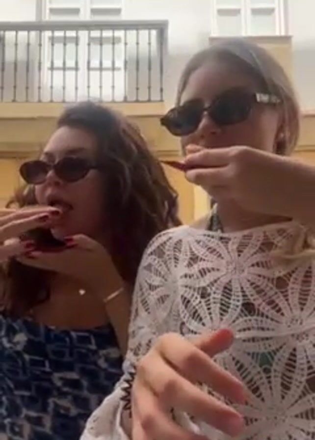 Here is a detailed description of the video: The video shows two young women sitting outside at a table, each eating a pastry. The woman on the left has brown curly hair and wears a blue and white printed dress. She is also wearing sunglasses and a bracelet. The woman on the right has blonde hair pulled back in a low ponytail. She wears a white crochet-style top over a dark swimsuit and sunglasses. Both women have their pastries raised to their mouths, taking a bite. The background consists of a building with white walls, a black railing, and windows. The scene appears to be filmed in daylight.