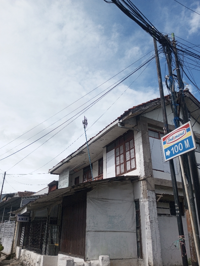 A two-story building with a brown-framed window is under a cloudy sky. A tall antenna is attached to the roof. A blue and white Indomaret sign on a utility pole shows "100 M" with an arrow pointing left. Electrical wires crisscross the sky and run along the building. The street has adjacent buildings with covered walkways and signs, including one that reads "WARUNG MAKAN AMIH." The overall view is from a street level perspective.