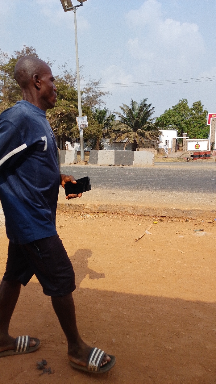 An older man walks along a dusty roadside, holding a black smartphone in his right hand. He wears a dark blue shirt with a white stripe on the sleeve, dark shorts, and Adidas sandals. Behind him is a street with a concrete divider. Palm trees and buildings are visible in the distance. A solar-powered street light stands tall on the side of the road. The sun casts a shadow of the man onto the ground.