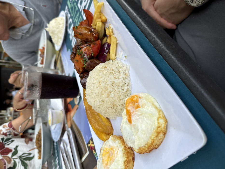 The image depicts a dining scene at a restaurant in the city of AMCO, Area Metropolitana Centro Occidente, Colombia. The primary focus is a large white rectangular platter positioned centrally on a table with a teal surface. On the platter, a meal consisting of several components is arranged: two fried eggs with slightly crispy edges, a mound of white rice, two pieces of fried plantain, and a stir-fried dish resembling Lomo Saltado. This stir-fry includes cubes of beef, red and orange bell peppers, red onions, and French fries, garnished with chopped green herbs. To the left of the main platter, a transparent glass contains a dark red beverage with condensation. Silverware, including forks and a knife, is stacked on a white napkin. A small white cup containing a yellow condiment is also present. Further in the midground, other white plates with food, including a bowl of brown granular food and another plate with white rice, are visible. The table surface beneath the placemat shows a printed design, possibly a menu or advertisement. Two individuals are partially visible at the table. On the left, a person with light skin wears a white shirt with a red and green floral pattern. Their left hand, adorned with a red bracelet, holds a fork near a bowl of food, indicating active dining. On the right, another person with light skin wears a grey polo shirt. Their head is partially visible, with glasses resting on their forehead. Their right hand, wearing a watch with a metallic band, rests near the edge of the table. The background is blurred, showing other indistinct figures and ambient lighting, consistent with a casual restaurant environment.