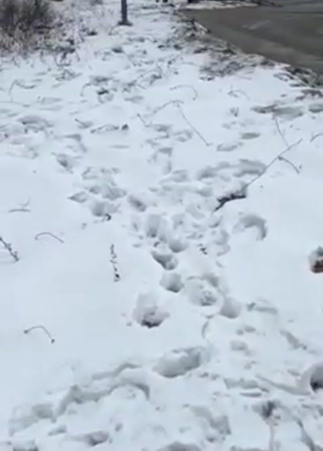 snow-covered streetscape in an urban environment. The camera pans from ground level, showing patches of snow and footprints on the ground, up to a view of a street intersection. Bare trees line the sides of the road. A white van with the word "FAMEG" and the phrase "SINCE 1881" is driving through the intersection, which has red and white pedestrian crosswalks. The traffic lights are red. The sky is overcast.