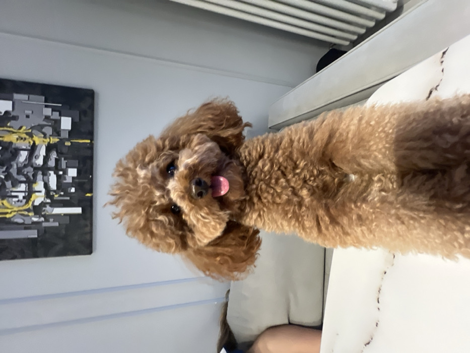 A brown-reddish Poodle stands upright on its hind legs in an indoor setting