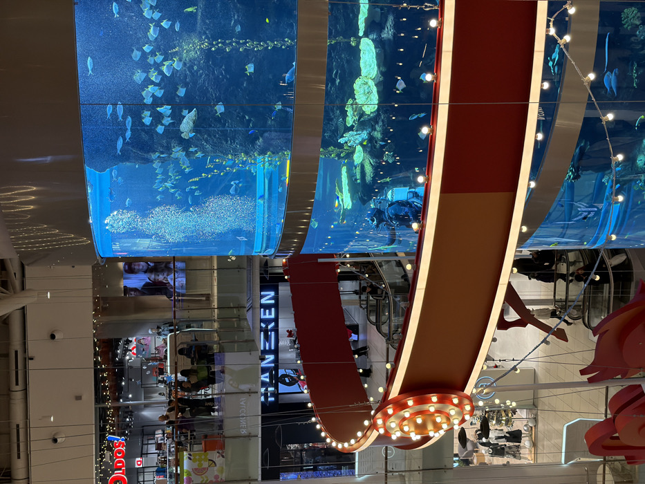A vibrant indoor scene features cylindrical aquariums teeming with fish and marine life suspended from the ceiling of a multi-story shopping mall. A diver is visible in one of the tanks. Red and tan decorative structures with strings of lights hang nearby, adding to the festive atmosphere. Escalators and retail shops are visible below, reflecting the bustling environment of the interior space.