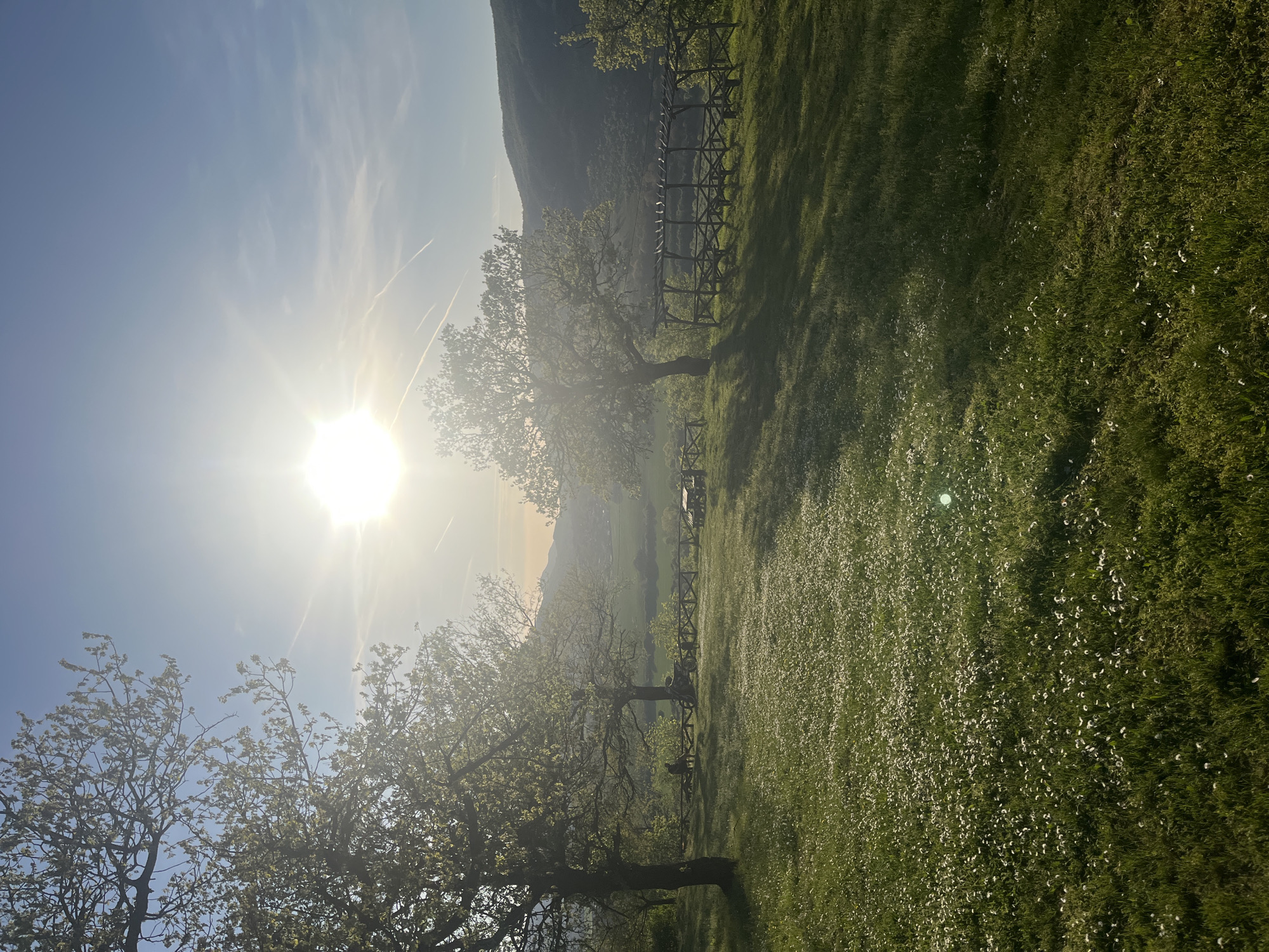 The image captures a sunlit landscape in Kormiansko, Bulgaria. A field of green grass interspersed with white wildflowers stretches across the foreground. A wooden fence runs along the field's edge, behind which stand several trees with budding leaves. The bright sun shines intensely in the sky, creating lens flare. In the background, a mountain is visible. No people are visible in the image.