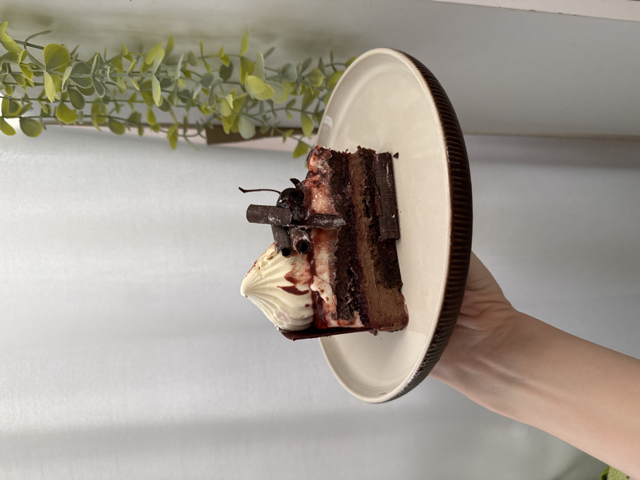- "A slice of Black Forest cake rests on a beige plate with a dark brown rim, held by a person's arm" by FM-XR4443, licensed under CC BY 4.0