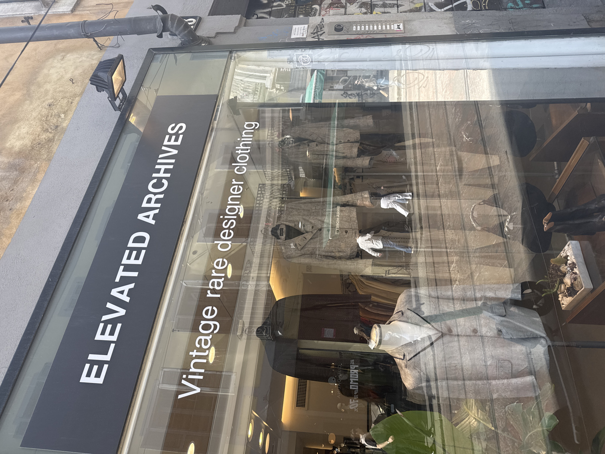 The image displays the storefront of a clothing boutique named "ELEVATED ARCHIVES" with the subheading "Vintage rare designer clothing