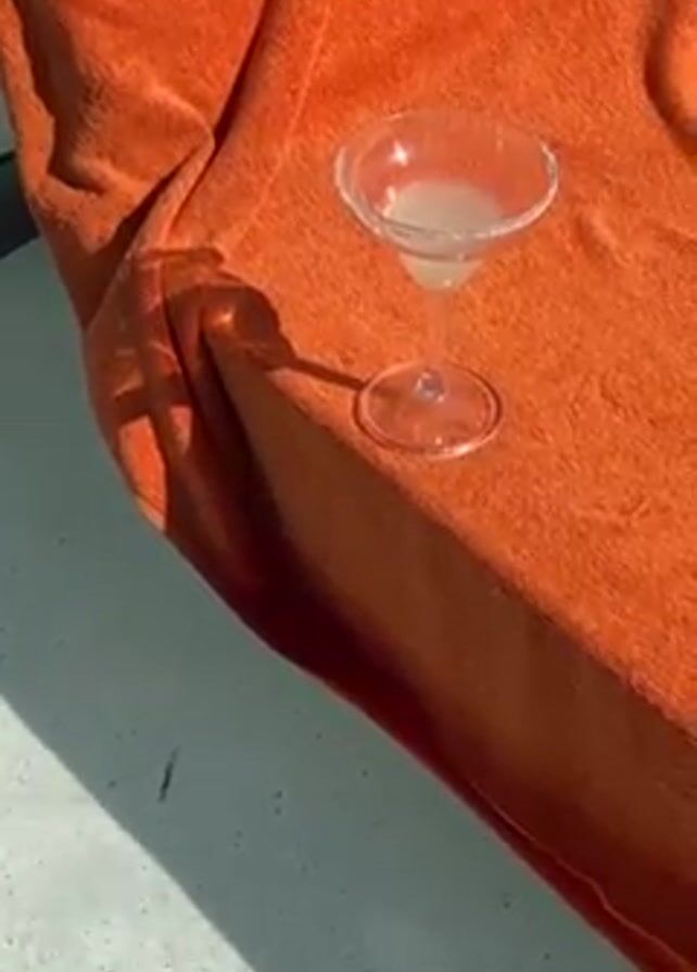 A cocktail glass containing a light-colored liquid sits on an orange towel draped over the edge of what appears to be a lounge chair