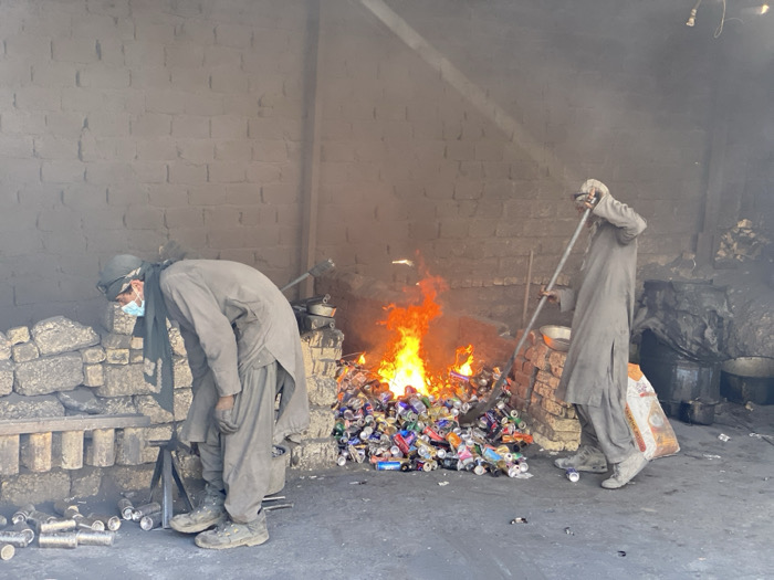 The image depicts an indoor aluminum recycling or smelting operation in Shurandam, Afghanistan