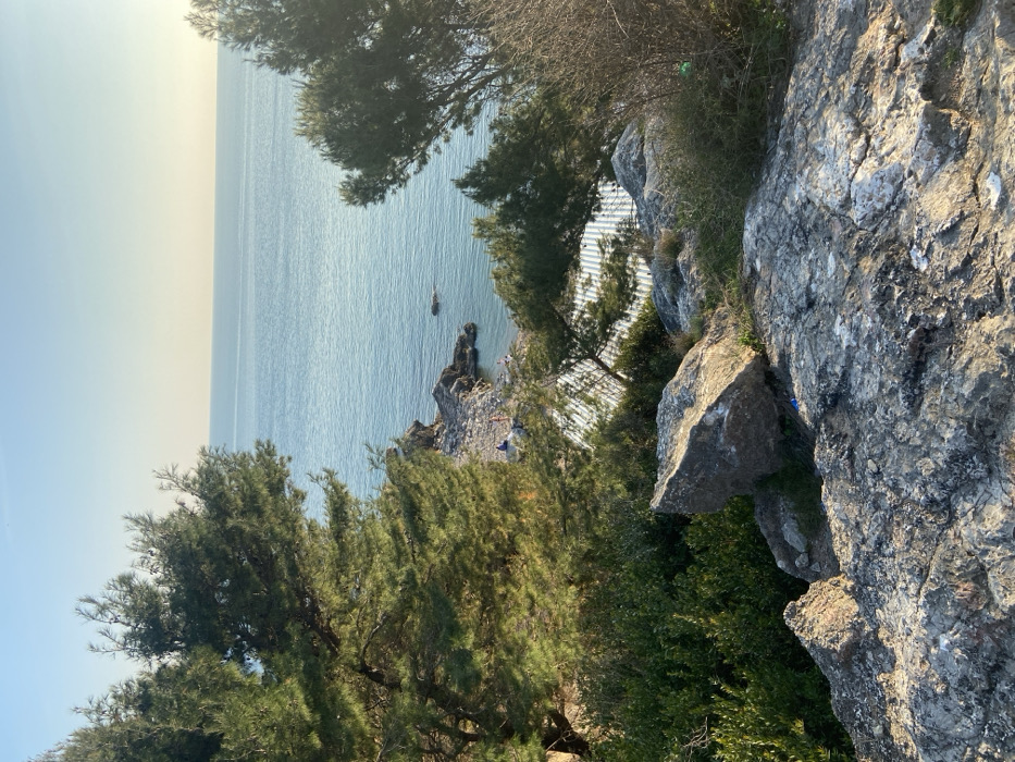 The image depicts an elevated coastal view in Zagrađe, Montenegro. In the foreground, large, weathered grey rock formations dominate the lower portion of the frame, interspersed with sparse green and brown vegetation. A blue plastic item is visible near a large boulder in the lower-left foreground, and a small green object is embedded in bare branches on the lower-right. The mid-ground features dense green pine trees, framing a view of the Adriatic Sea. Below the tree line and above the foreground rocks, a white and grey corrugated roof structure is partially visible on the downward slope. In the background, the calm, light blue sea extends to a distant horizon under a clear, pale blue sky. A small, rocky pebble beach is discernible at the base of the cliffs below the mid-ground vegetation. Several indistinct human figures are present on this beach near the waterline; their specific actions are not clearly identifiable due to distance, but they appear to be stationary or moving slowly. One dark rock is partially submerged in the water near the beach.