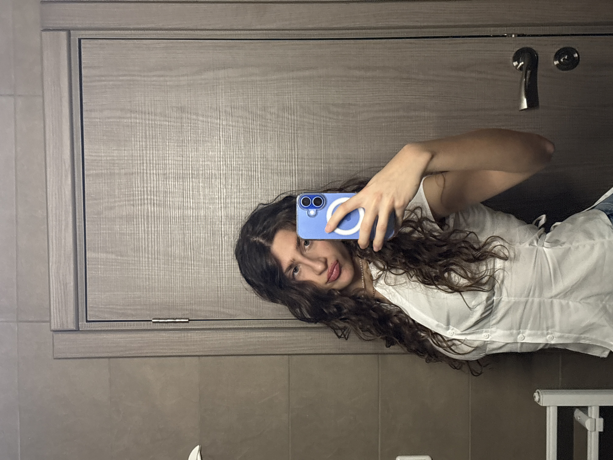 A female individual is depicted in a mirror selfie, holding a light blue smartphone with a white MagSafe accessory in her right hand, capturing her reflection. She has long, dark, curly hair and her lips are pursed. She is wearing a white short-sleeved, collared button-down shirt and a light-colored necklace. The background consists of an interior room, likely a bathroom or changing area. The left wall is tiled with light brown/beige rectangular tiles laid horizontally. A partially visible white fixture, possibly a towel rail, is located on the bottom left. A light-colored wooden door with horizontal grain, a silver-toned handle, and a lock mechanism is present on the right side of the image. The specific location within Sofia, Bulgaria, cannot be determined from the provided interior details.