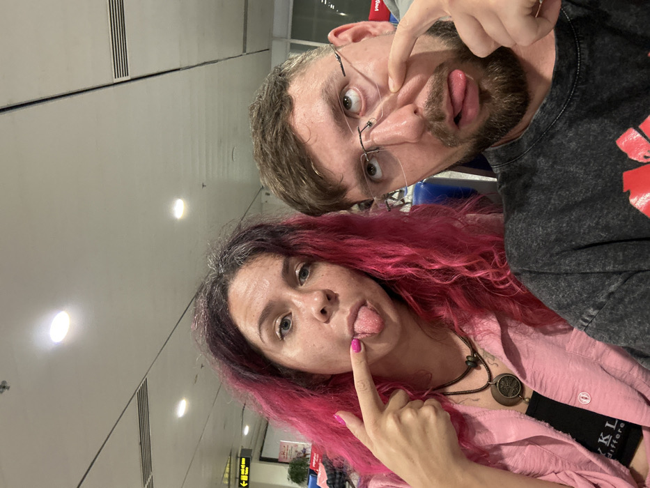 A selfie captures a man and a woman making silly faces. The man, bearded and wearing glasses, pushes his nose up with his finger while sticking out his tongue. The woman, sporting pink hair with darker roots, also sticks out her tongue and points to it with her finger. They are indoors, likely in an airport or public space with bright overhead lighting. A sign is visible in the background.