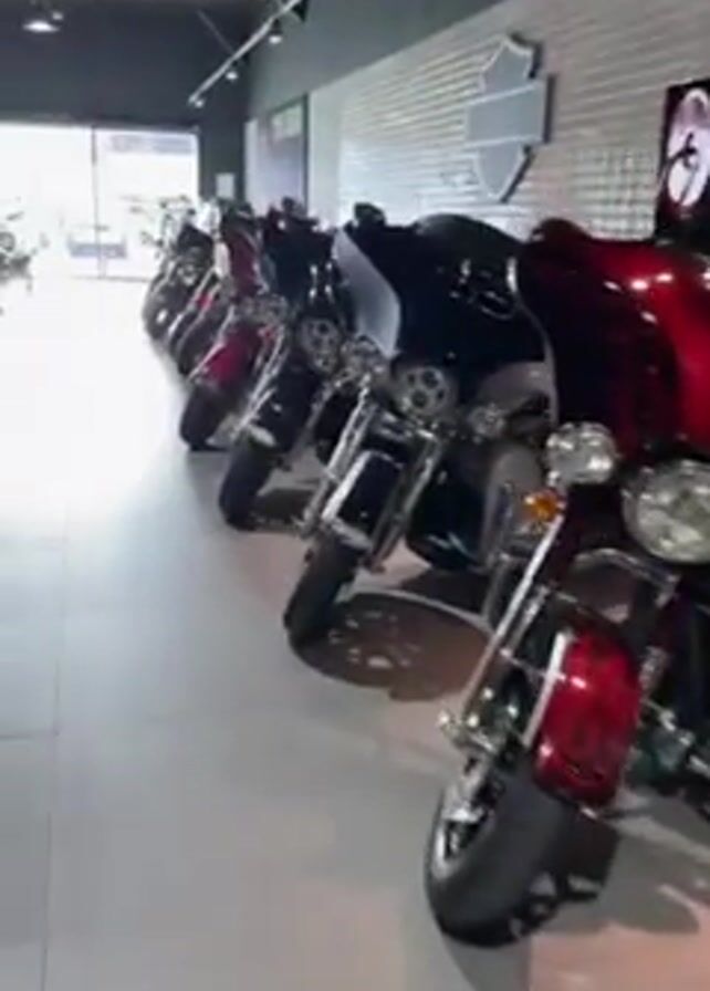 interior of a Harley-Davidson motorcycle dealership. The camera pans across rows of motorcycles, displaying models in black, red, and other colors. The motorcycles are parked neatly in two rows. The building appears to be well-lit with a gray floor and a dark gray ceiling. A large window provides natural light in the front. On the walls, there are Harley-Davidson signs and decorations.