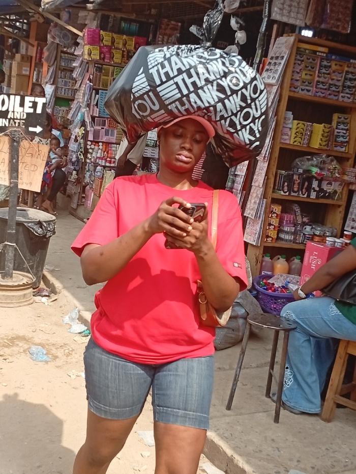 A woman stands in what appears to be a market setting, engrossed in her mobile phone. She balances a large black plastic bag printed with the words "THANK YOU" on her head. The woman is wearing a red t-shirt, denim shorts, and a light pink cap. Behind her, shelves are filled with various goods. Signage visible in the background indicates a toilet or sanitation facility.