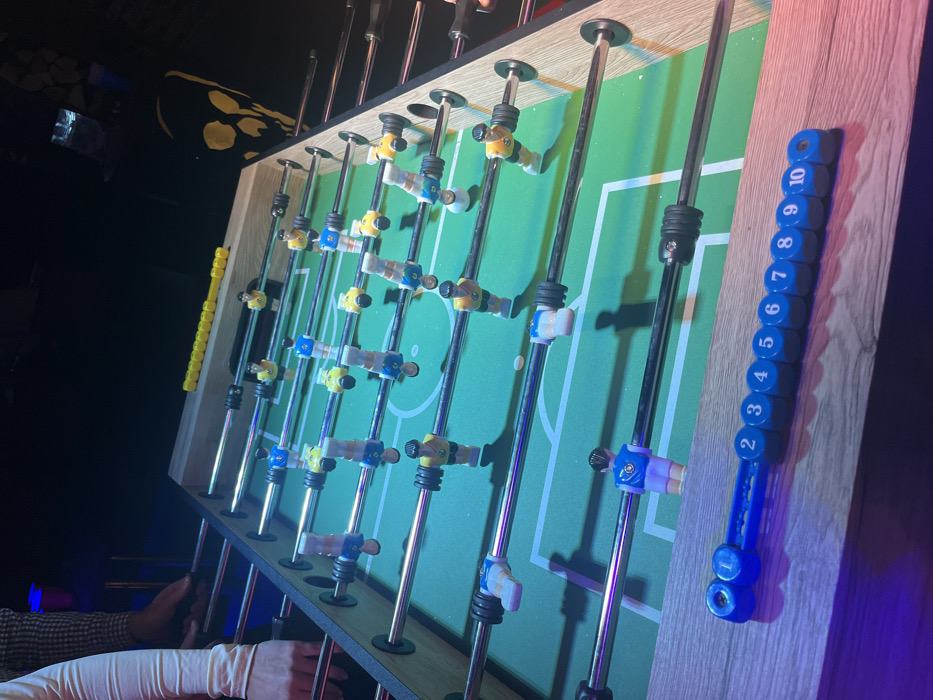 - "The image displays a foosball (table football) game in progress, illuminated by strong artificial blue-cyan lighting within a dimly lit indoor entertainment venue" by FM-KILrf2, licensed under CC BY 4.0