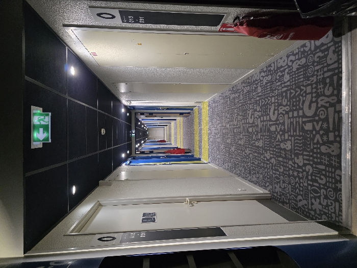 An elongated hotel corridor receding into the distance. On the left, dark blue paneled walls with emergency exit signs and inset lighting. White doors with room numbers line both sides of the hallway. The carpet is a pattern of symbols and letters in grey. A yellow stripe runs down the middle of the corridor. The perspective is slightly rotated, creating a warped effect, with a focus on the receding vanishing point.