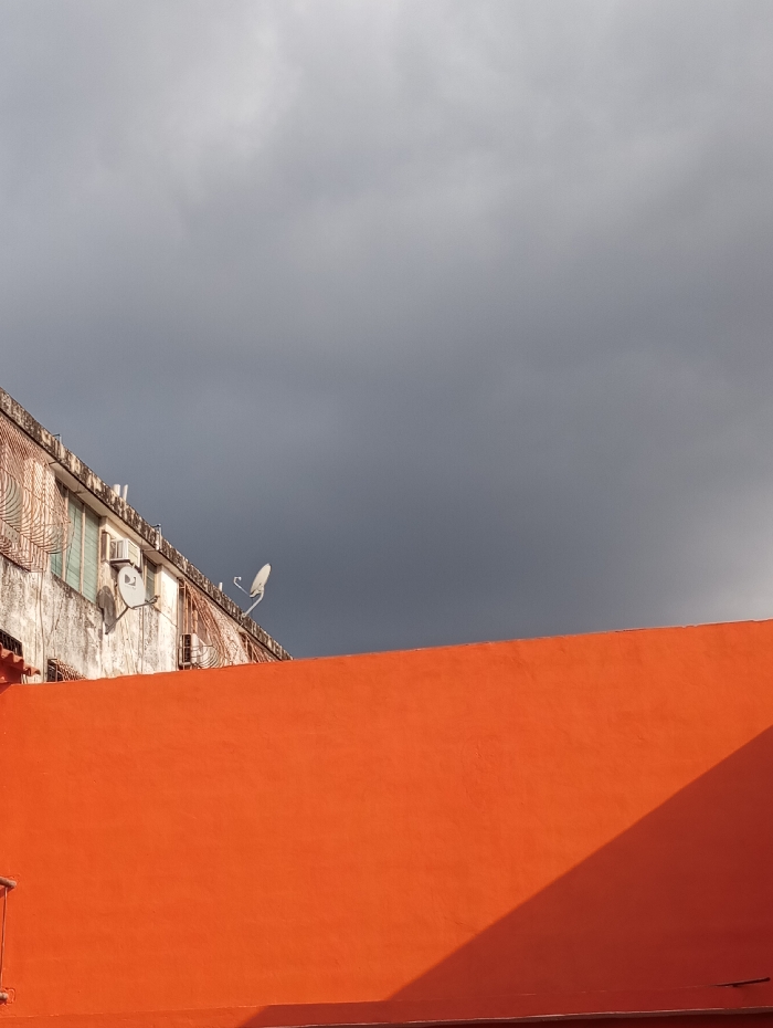 The image displays an urban scene in Guacara, Venezuela, under a heavily overcast sky. The upper two-fifths of the frame consists of dense, dark gray cloud cover. The lower three-fifths is occupied by a substantial, unadorned orange-colored wall or building section, extending horizontally across the frame. A sharp, diagonal shadow is cast upon the lower right quadrant of this orange surface, indicating a light source from the upper left. Above the orange wall, a portion of an older, distressed building is visible to the left. This background structure features a light-toned, possibly white or off-white, facade exhibiting weathering, discoloration, and what appears to be rust-colored staining or material near its upper edge. Attached to this building are several exterior air conditioning units and two white satellite dishes positioned near the roofline. A window with light blue louvered shutters is also discernible. No human figures or discernible actions are present.