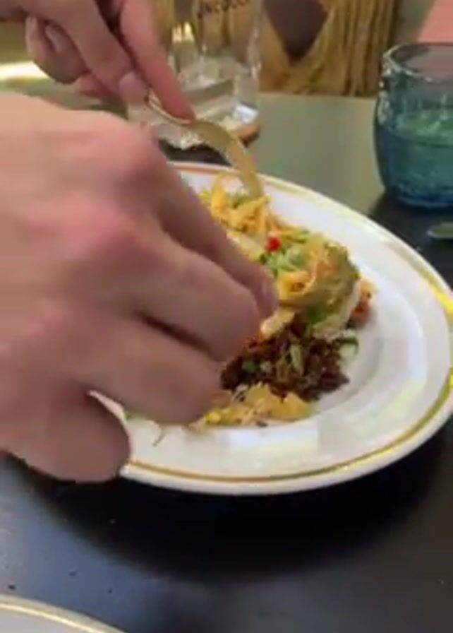 close-up of a white plate with a gold rim, containing a dish of rice, shredded fried onions, diced cucumbers, and a creamy sauce. A person with fair skin is using a gold fork to mix the ingredients on the plate. A clear glass with the word "Jacquemus" printed on it and a textured blue glass are also visible on the table. Another person is sitting across the table.