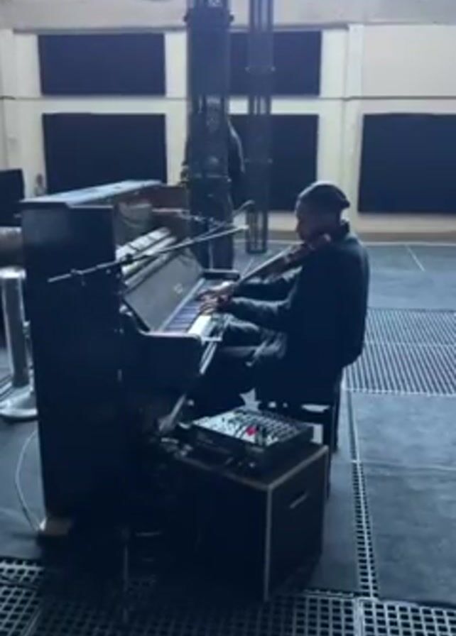 In a low-lit space with a high ceiling and a grey latticed floor, a man is seated at an upright piano, playing while also holding and using a violin. He wears dark clothing and a cap. A small amplifier and mixing board sit to the left of the piano. Behind him, another person stands, working on some type of musical equipment. Large, black panels are mounted on the back wall. Tall, black, industrial-looking structures stand on the right side of the shot.