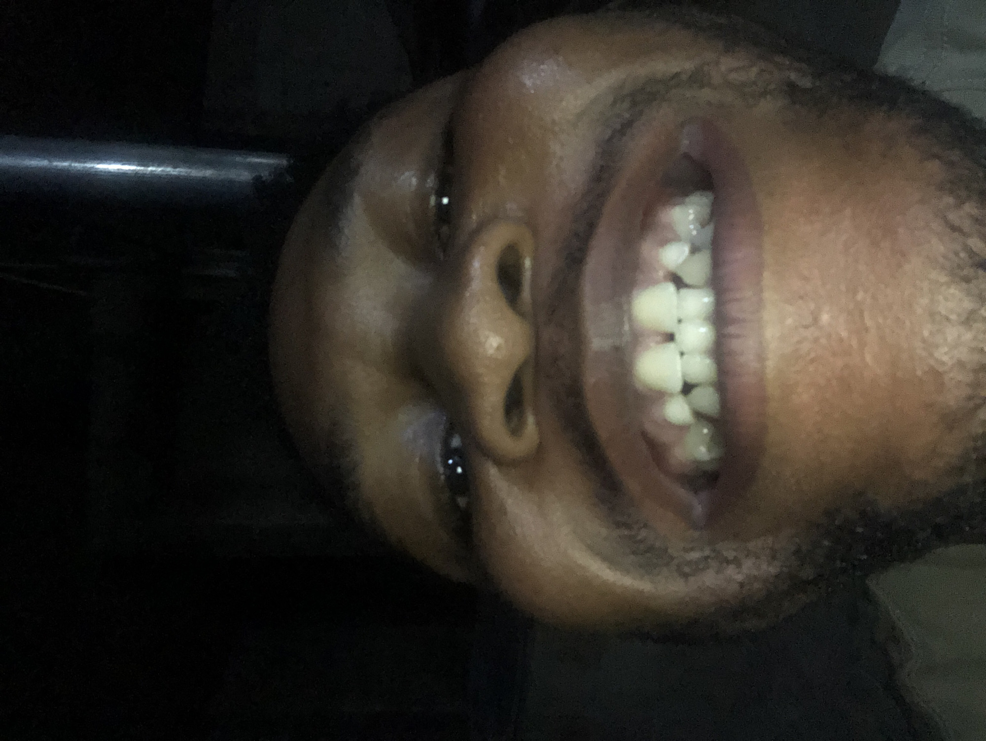 A close-up photograph depicts a man's face tilted at an angle. The man has dark skin, visible teeth, a nose, and eyes. The background appears dark, with a metallic object visible on the left side of the frame. The location and city are unknown.