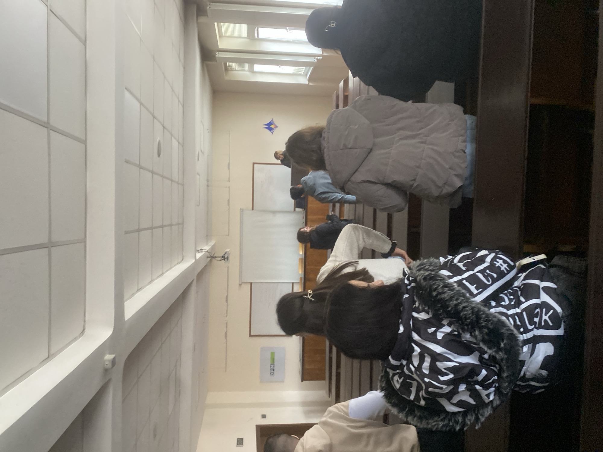The image depicts an indoor scene within a lecture hall at the Faculty of Physics, Sofia University "St. Kliment Ohridski", located in Sofia, Bulgaria. The perspective is from the rear of the hall, looking towards the front. Approximately ten individuals, primarily young adults, are present. Most are observed from behind, seated in tiered rows of dark wooden benches with integrated desks, facing the front of the room. In the immediate foreground, a person wears a black and white patterned hooded jacket with a dark fur trim. To their right, another individual wears a light grey quilted jacket. Further left, a person in a beige hoodie is partially visible. A fourth individual, with long dark hair secured by a gold-colored claw clip, wears a light-colored top. The room features light-colored walls, a white grid-panel ceiling with structural beams and integrated lighting, and tall, multi-paned windows on the right wall. A small white sensor is mounted on a ceiling beam. The front of the hall includes a raised platform with a dark wooden podium. Behind the podium, an individual stands, partially obscured, appearing to address the assembly. Two whiteboards and a pull-down projector screen are positioned on the front wall. A banner displaying "DPM" and a logo is affixed to the left wall. An "EXIT" sign is visible above a doorway on the far left. A blue and gold decorative emblem is on the right wall near the front. The overall scene suggests an academic lecture or presentation in progress.