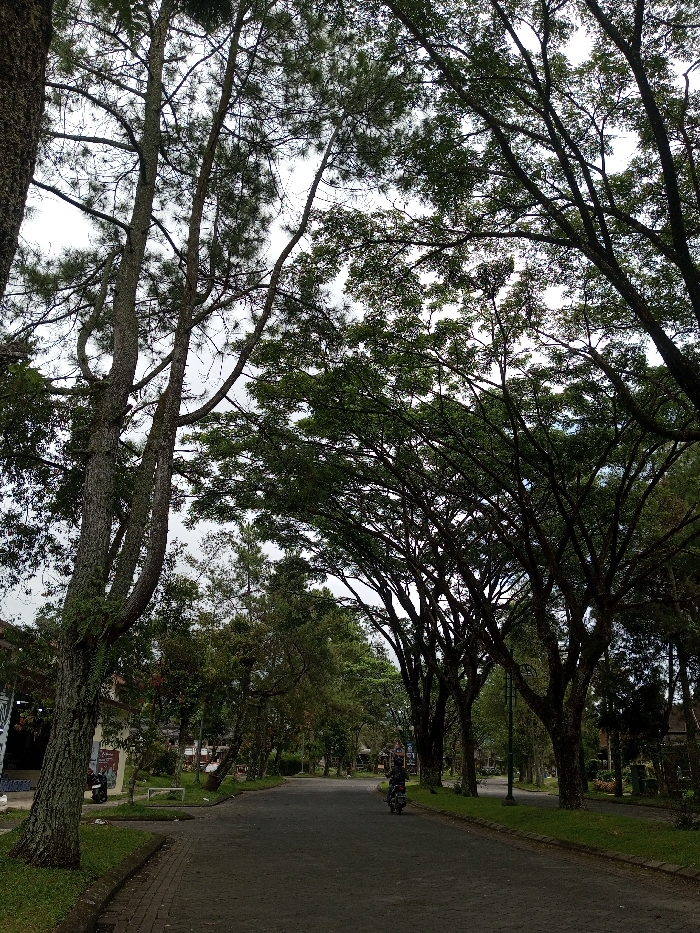 A road extends into the distance, shaded by tall trees forming a dense canopy overhead