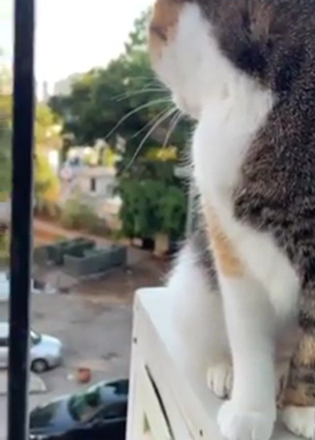 - "A tricolor cat sits on top of an air conditioner unit on a balcony, looking out at a park-like area in a residential setting" by FM-k41Xm2, licensed under CC BY 4.0