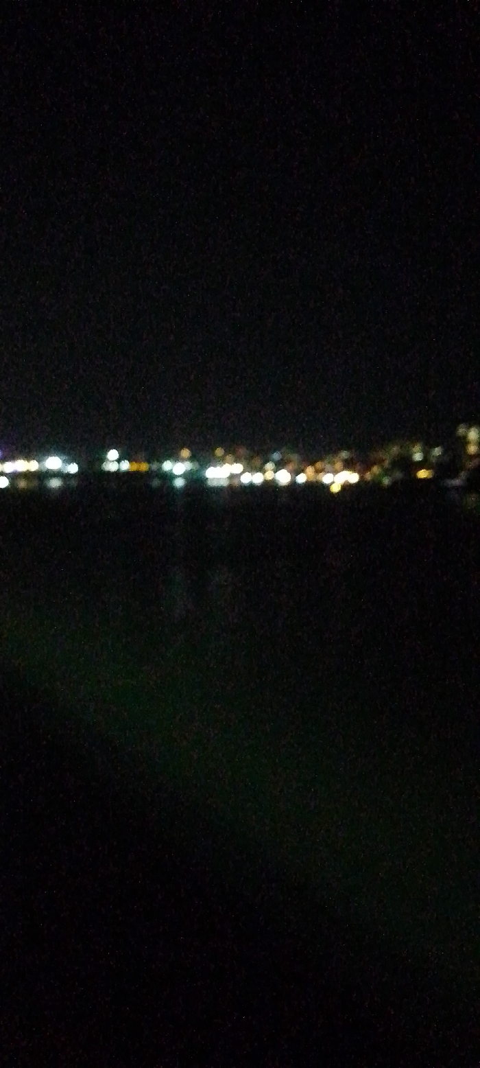 The image displays a nighttime scene, predominantly dark. A horizontal line of blurred, multi-colored lights, appearing as bokeh, stretches across the mid-ground. These lights are primarily white, yellow, and orange, with some green hues, suggesting a distant urban or residential area. The upper third of the image is a dark, indistinct sky, while the lower two-thirds are a dark, featureless expanse, likely water or unlit land. No individuals, specific structures, or discernible objects are visible. The scene is presented as a panoramic view of illuminated distant buildings or infrastructure in Junda ward, Kenya.