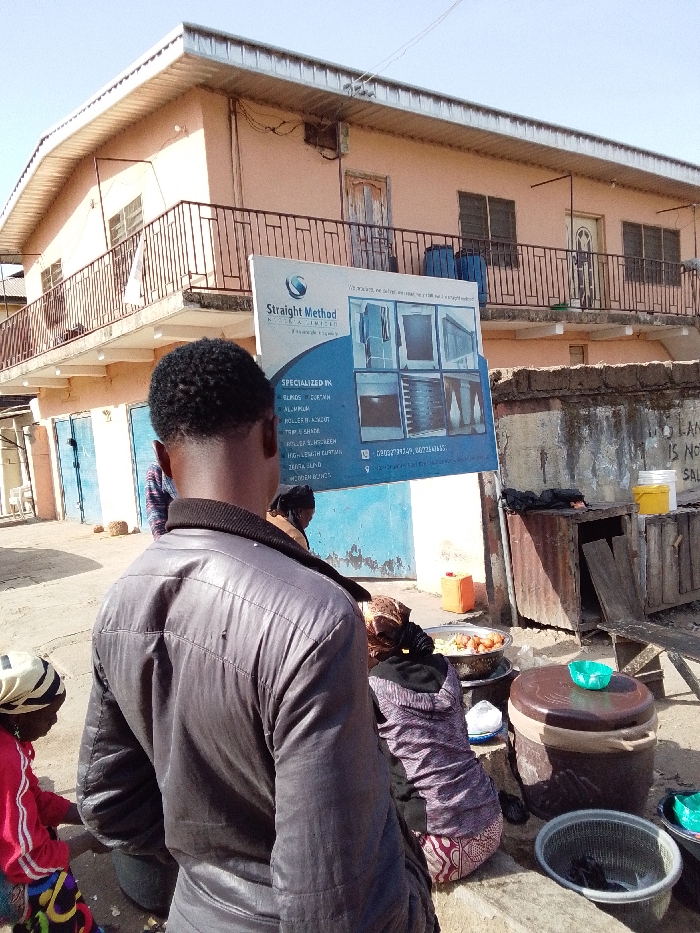 This image depicts an outdoor urban scene in Jos, Nigeria, characterized by commercial activity and residential structures under a clear sky. In the immediate foreground, a person with dark, short, curly hair is seen from the rear, wearing a dark grey puffer-style jacket over a dark collared garment. To the viewer's right of this person, a younger individual in a red and white striped long-sleeve shirt and patterned trousers, with a light head covering, is partially visible, positioned low to the ground. To the viewer's left, a person is seated on the ground, facing away, clad in a dark top with a hood and a patterned lower garment. This individual is positioned near a food preparation area, featuring a large metal bowl containing fried items on a small stand. Nearby are a dark brown cylindrical container with a light green bowl on top, and a silver colander holding dark objects. In the midground, a large blue and white commercial sign for "Straight Method NIGERIA LIMITED" is angled towards the viewer. The sign advertises "SPECIALIZED IN: BLINDS, CURTAIN, ALUMINUM, ROLLER BLINDS, TRIPLE SHADE, ROLLER SUNSCREEN, HIGH-LENGTH CURTAIN, ZEBRA BLIND, WOODEN BLINDS," displaying product images and contact numbers. Behind the seated individuals, a low, rough concrete wall features graffiti, partially visible as "LAN IS NO SAL." Behind this wall, a makeshift stall constructed from corrugated metal sheets and wooden planks is present. To the left, several light blue roll-up metal doors of ground-floor shops are visible. An orange jerrycan, a yellow bucket, and a white bucket are situated near the makeshift stall and wall. The background is dominated by a two-story building with a light peach-colored facade and a light-colored eave. The first floor features a continuous balcony with dark metal railings. Several windows with horizontal slats are visible on both floors. Two weathered wooden doors are on the first floor, and an air conditioning unit is mounted on the wall. Two blue plastic barrels are on the first-floor balcony. The ground throughout the scene appears unpaved, rough, and dusty.