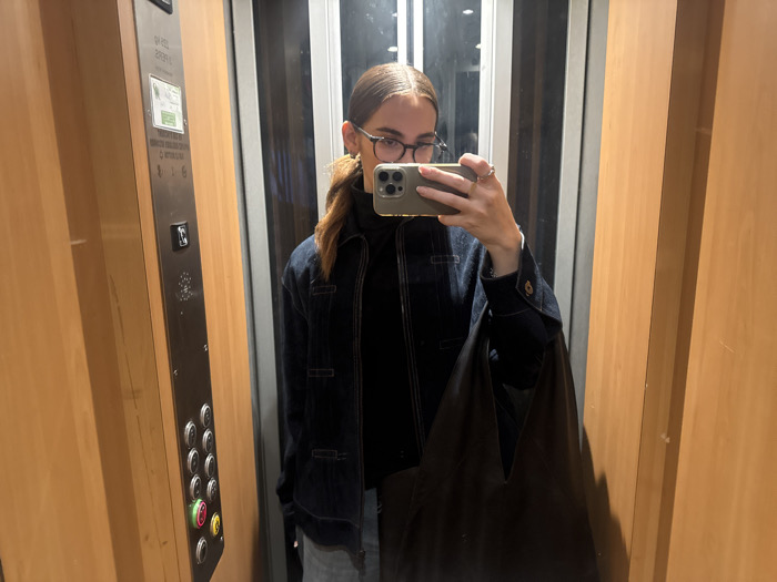 The image displays a mirror selfie taken by an individual inside an elevator in Paris, France. The elevator interior features light brown wood paneling on the walls. A dark grey control panel is mounted on the left wall, containing multiple circular buttons, with illuminated green and red buttons visible at the bottom. Above these buttons, a data plate is affixed, displaying text including "Paris," "2139 L," and "QU.2023." The reflected individual is a young adult with light brown hair pulled into a ponytail and wears circular spectacles. They are dressed in a dark turtleneck shirt, covered by a dark blue denim jacket. Light-colored trousers are partially visible. The individual is actively taking the photograph using a light-colored smartphone, held in their right hand, with multiple rings visible on the fingers. A large, dark fabric tote bag is carried on their left side. The reflection behind the individual shows the closed elevator doors.